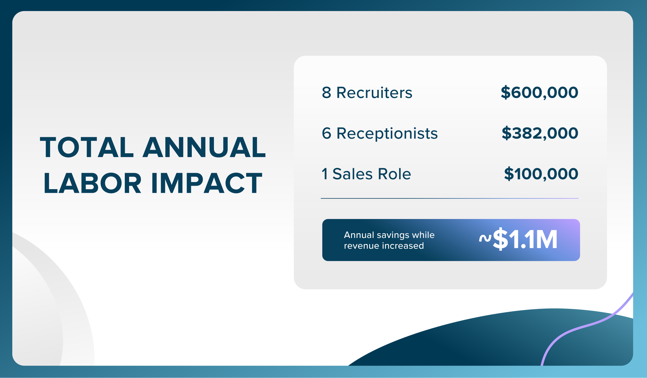 Next, cost savings. By not having to backfill the roles of 8 recruiters, 6 receptionists, and 1 salesperson, Staffworks is able to save $1.1 million each year.