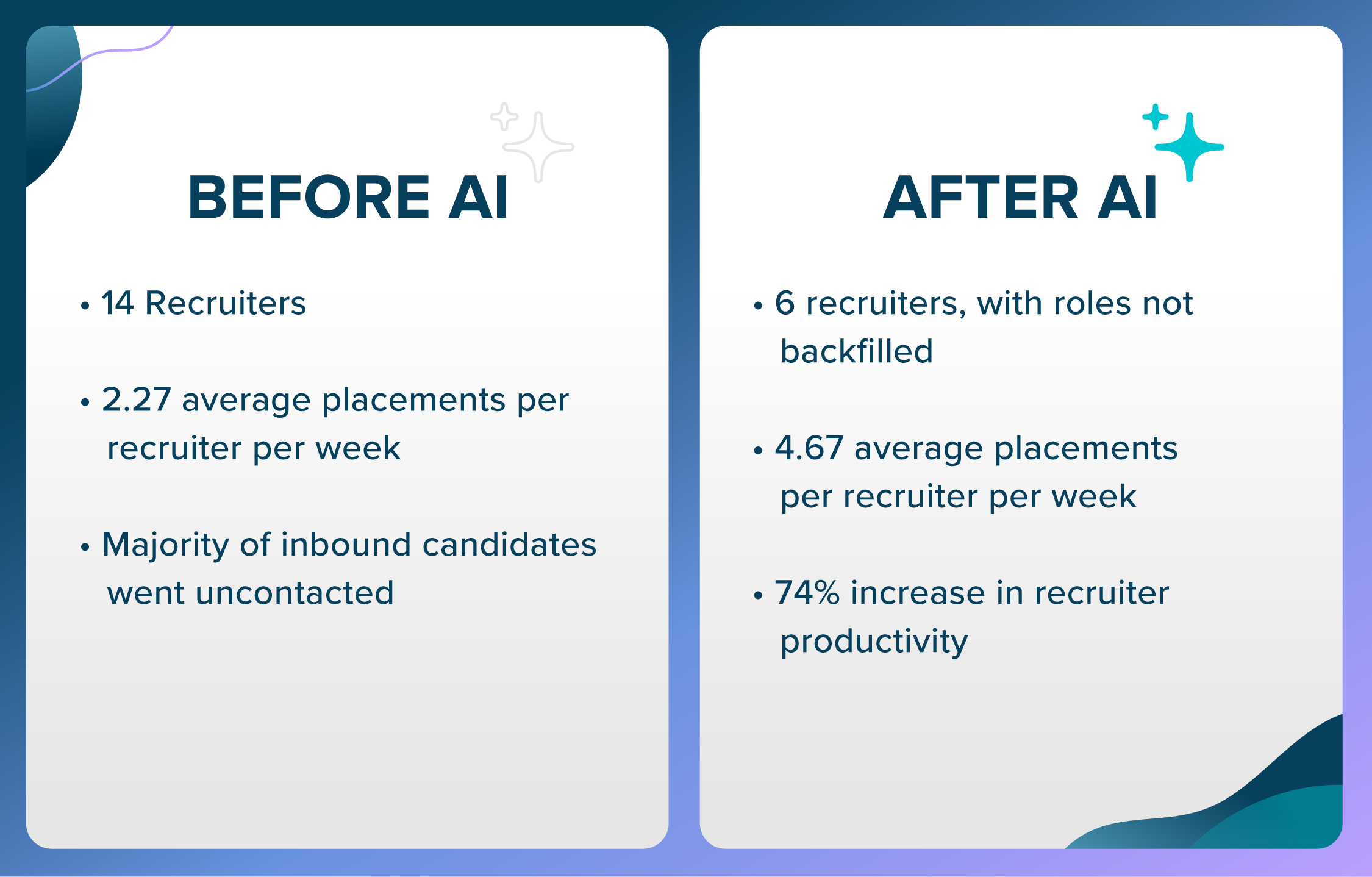 Productivity also increased. Before leveraging TempWorks AI ecosystem, recruiters were averaging 2.72 placements per week; with the new system in place, that number jumped to 4.67. In total, Staffworks saw an increase of 74% in recruiter productivity.